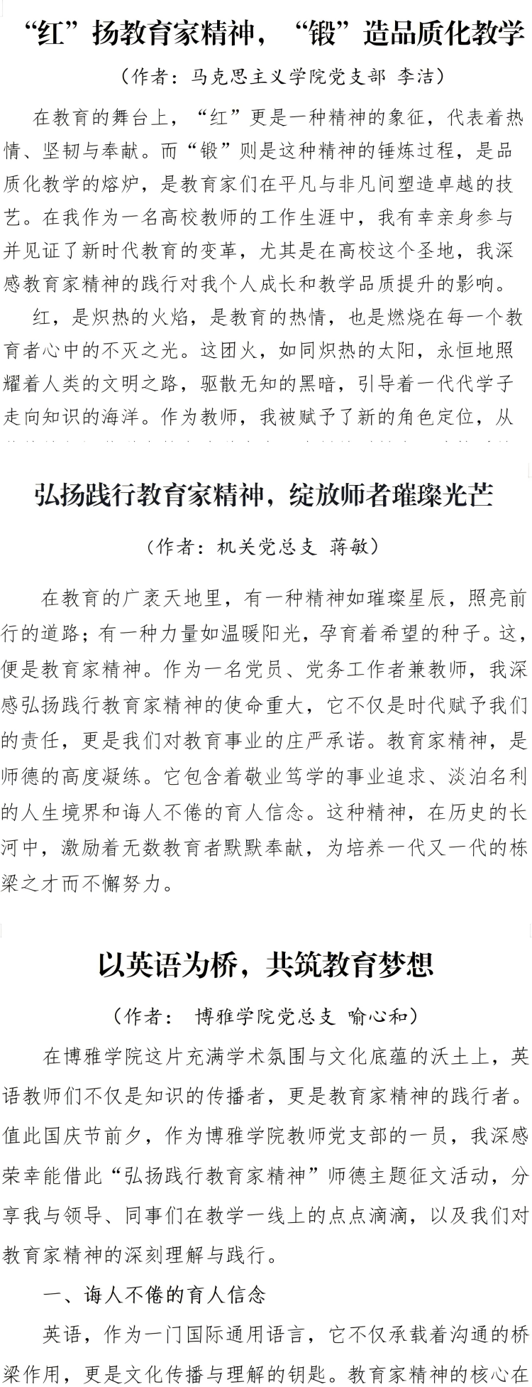 为深入学习和弘扬教育家精神,加强教职人员师德师风建设,提升教师的教育理念和人文素养,我校于近期举办了“弘扬教育家精神”征文活动。此次征文比赛得到了各基层党组织的积极响应,纷纷踊跃投稿。