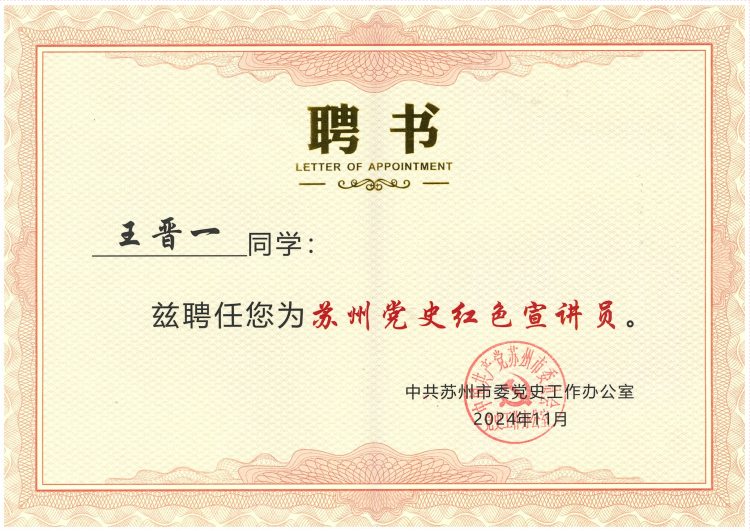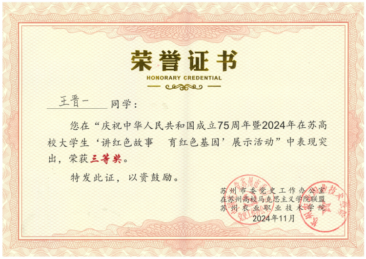 马克思主义学院在学校内部进行初选,大数据技术2401班王晋一以第一名的成绩脱颖而出,代表学校参赛,在刘涛老师的指导下,对讲稿文本、背景PPT、音频以及语言表达、舞台掌控进行反复打磨演练。参赛作品以“不朽的青春 献给最伟大的党”为题目,讲述了沙家浜抗日女英雄朱凡不平凡的一生,演讲突出红色主题,故事情节悲壮感人。比赛当天,王晋一作为一号选手登台,指导老师在现场扮演朱凡,王晋一扮演当代大学生,师生演绎了一场穿越时空的对话,将故事的情感推向高潮,着重突出了红色信仰的力量,获得了评委组的好评。王晋一最终在21支队伍的精彩角逐中,荣获三等奖,并被受聘为“苏州党史红色宣传员”。