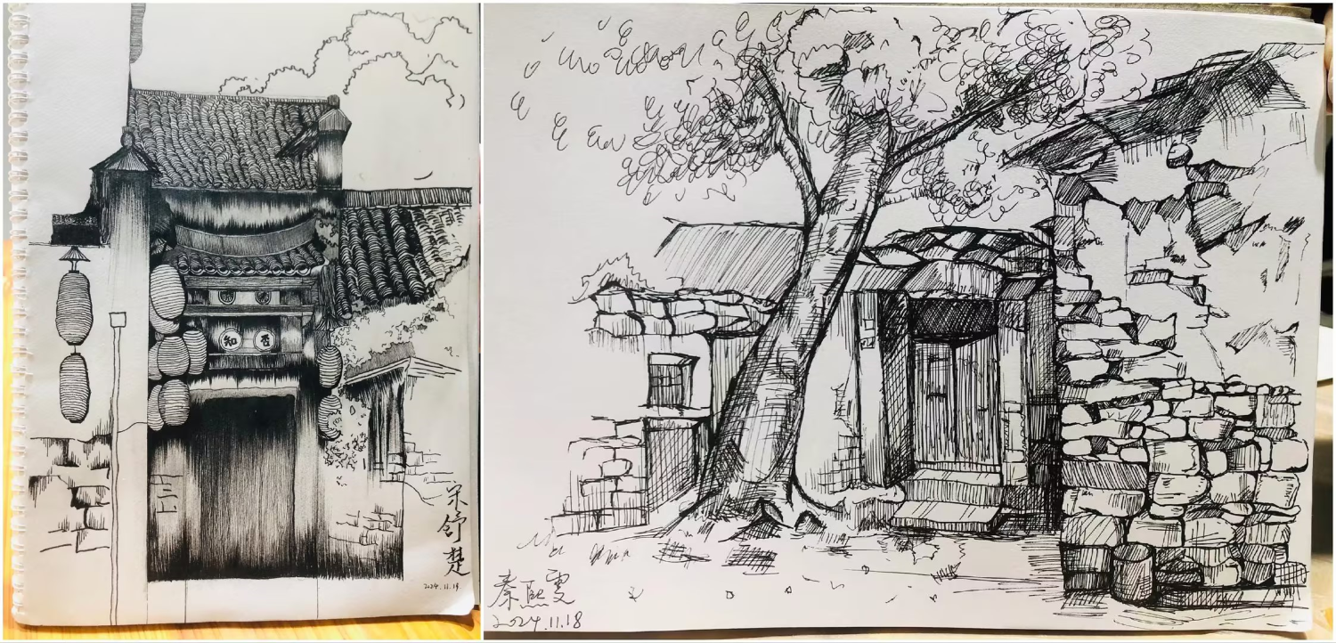在写生之旅中,学生们前往了宏村和塔川这两个典型的徽派古村落,感受传统村落的独特魅力。宏村古朴的徽派建筑与自然山水相映成趣,塔川的秋色更是为写生创作提供了无尽灵感。在这片富有文化底蕴的土地上,学生们通过亲身体验,深入理解了“天人合一”的艺术理念,画笔下的山水更加生动、富有灵气。
