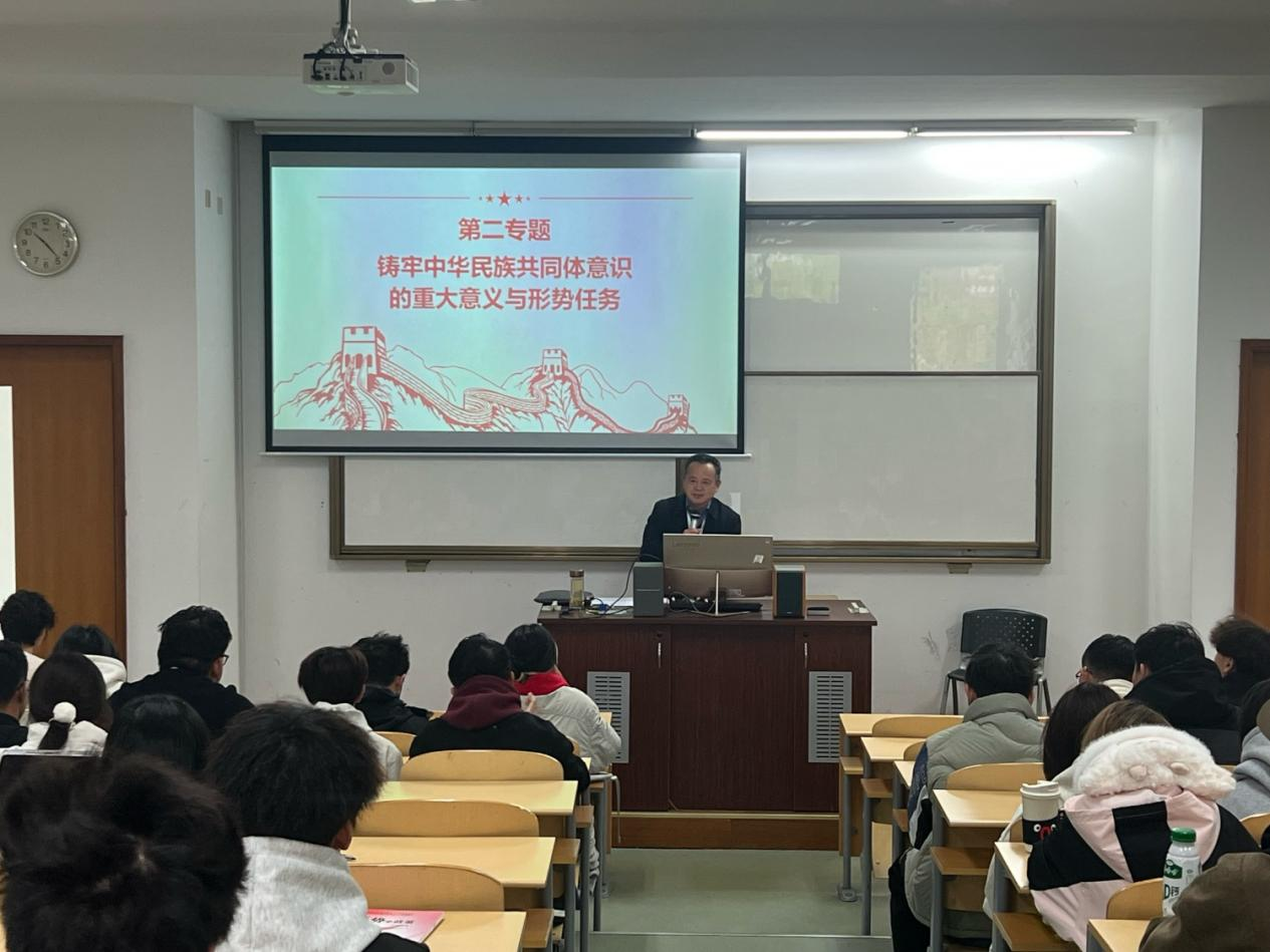 副校长沈宗根以“铸牢中华民族共同体意识的重大意义与形势任务”为主题,从中华民族共同体意识的深刻意蕴、百年来中华民族共同体意识不断丰富、铸牢中华民族共同体意识的时代之需、新时代新征程推动铸牢中华民族共同体意识落到实处几个方面使学生深刻理解中华民族共同体意识的深刻意蕴、发展历程以及重大意义,引导学生认识新时代新征程中推动铸牢中华民族共同体意识的具体任务和方法,培养学生的民族认同感、文化认同感和国家认同感,增强民族团结意识,勇做担当民族复兴大任的时代新人。