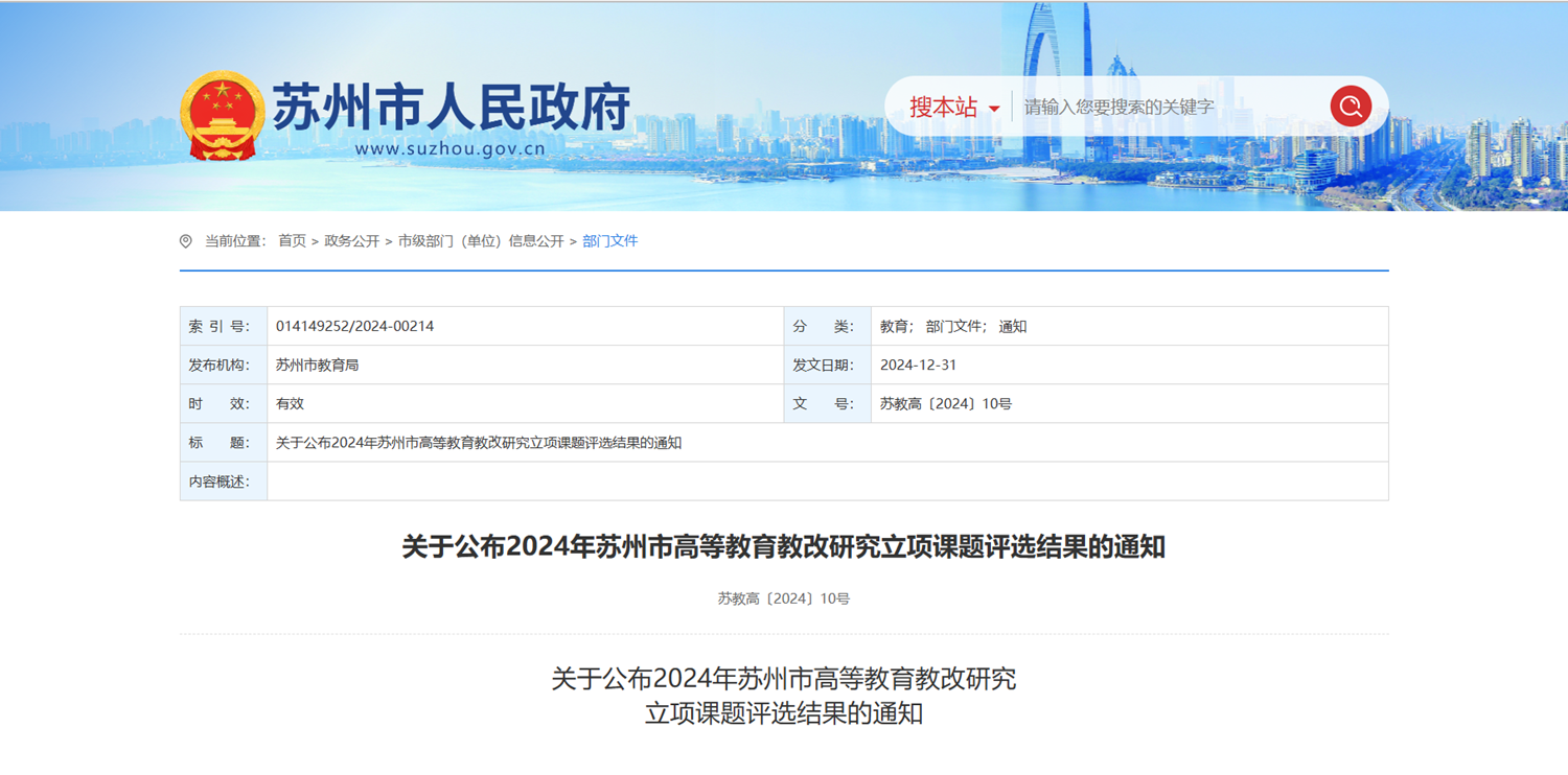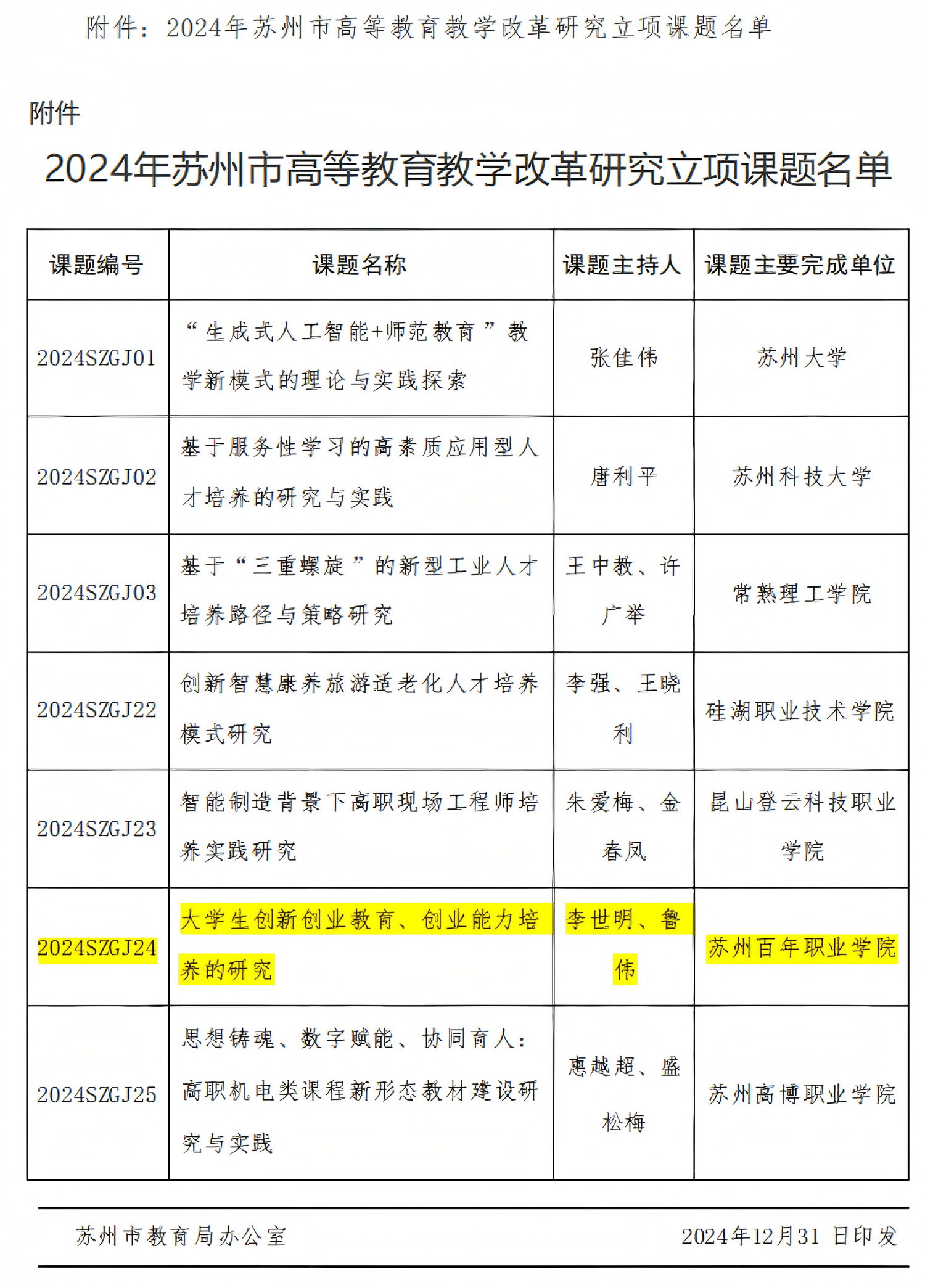 根据《关于开展2024年苏州市高等教育教改研究课题立项建设申报工作的通知》(苏教高〔2024〕7号)精神,经学校申报、专家评审、结果公示,共评选2024年苏州市高等教育教改研究立项课题25项,现予以公布。其中我校李世明、鲁伟作为主持人联袂领衔申报的课题《大学生创新创业教育、创业能力培养的研究》获得正式立项,项目编号为2024SZGJ24。预祝课题组取得丰硕研究成果,按期结项。