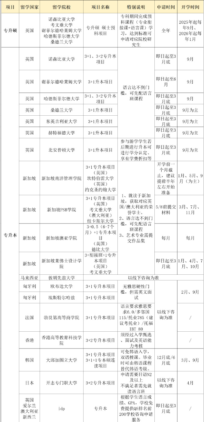 | 专升硕 | 英国 | 诺森比亚大学 | 硕士预科项目 | 专科期间完成预科课程(专业衔接课+语言课)学习,达到标准可申请对应院校研究生 | ||