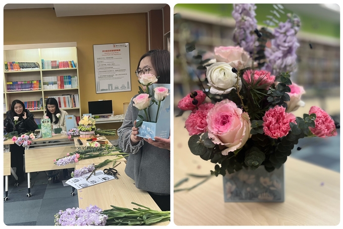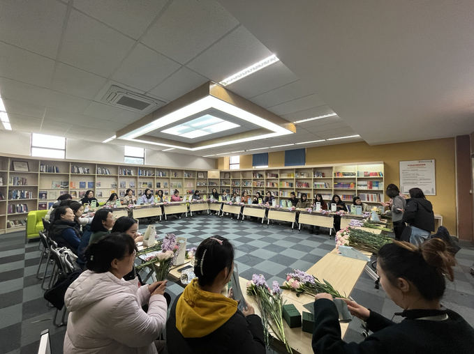 指尖花艺,绽放美丽: 在未来工匠学院蔡亚波老师的悉心指导下,老师们精心挑选鲜花,认真修剪枝叶,将玫瑰、紫罗兰、康乃馨、尤加利等花卉巧妙搭配,制作出一束束独具匠心的花艺作品,充分展现了我校新时代女教职工积极向上、热爱生活的精神风貌。