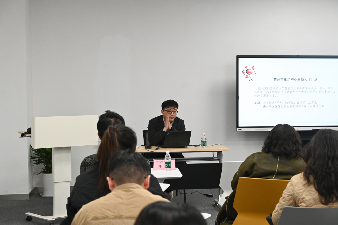 同时,苏州人社局的专家针对人工智能领域人才的具体奖补政策进行了详细讲解,明确了奖补标准、申请条件以及评审流程等关键信息,为我校及企业提供了宝贵的政策指导。