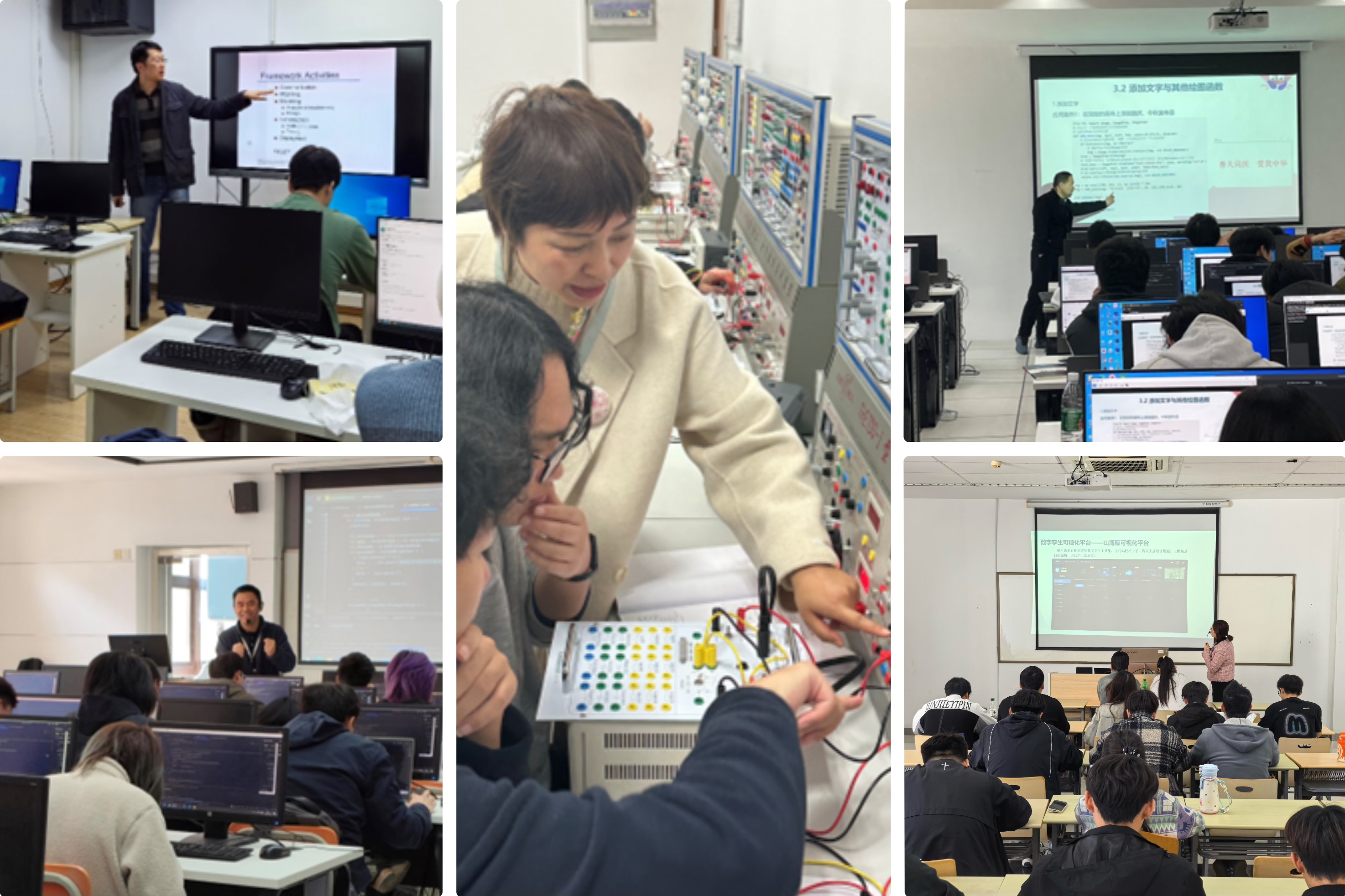 本次示范课涵盖CC教学、AI赋能、理实结合、实训室实践授课、项目化课程教学等多个主题,5位骨干教师以各具特色的教学展现了卓越的教学智慧。侯玉杰老师在《电路分析基础》实训课中通过卓越的课堂管理、教学技巧、科学分组和设备管理实现实训课堂100%专注度,为青年教师树立了实训课程的标杆。黄勇老师《大数据应用项目开发》课程深度融合AI工具与生活案例,以其富有激情的授课风格配合项目化任务设计,有效培养了学生解决实际问题的能力。沈刚老师的全英文课程《Software Engineering Fundamentals》运用分层案例教学法,通过生活化案例和随堂练习,实现小班教学效果最优化。张从文老师在《图像处理及机器视觉》中使用AI赋能教学,引导学生使用DeepSeek工具解决技术问题,同时融入"爱我中华"主题创作,实现知识传授与价值引领的有机统一。奚彩燕老师在《工业互联网应用基础》中“理实”结合,采用山海鲸可视化平台演示工业互联网数字孪生技术的实操,充分体现“理论-实践-创新”的教学闭环。两位新入职的青年教师陈曦、夏国强的亮相课分别通过生活化案例解析和仿真实操训练展现教学潜力。