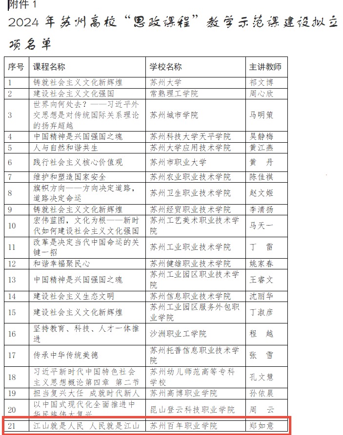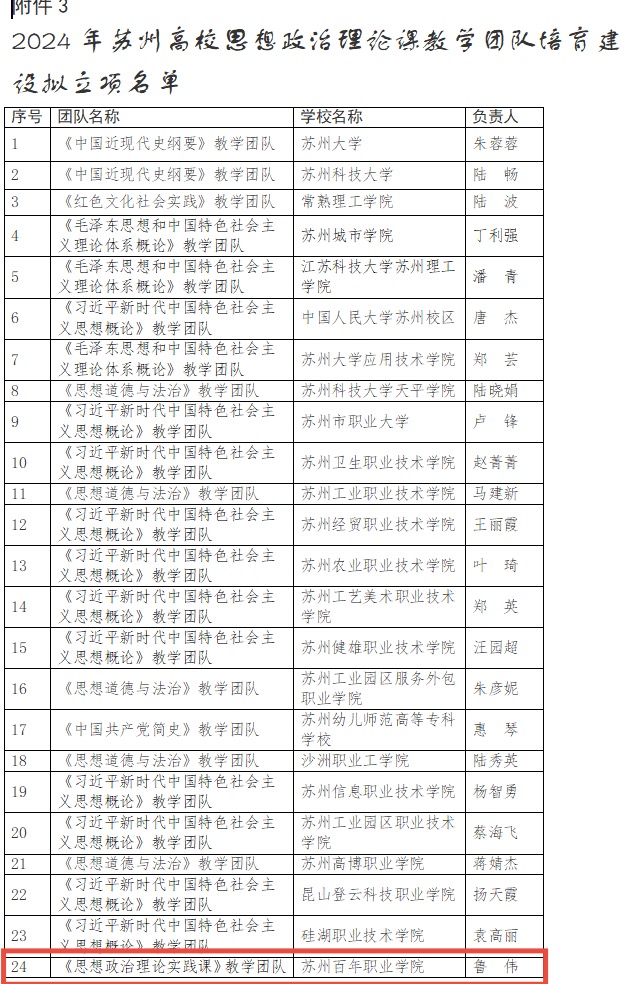 近期,苏州市教育局公布了《关于公布2024年苏州高校“思政课程”和“课程思政”教学示范课、思想政治理论课教学团队培育建设项目名单的通知》(苏教高〔2025〕1号)文件,我校《思政理论实践课教学团队》入选苏州高校思想政治理论教学团队培育建设项目名单,《江山就是人民 人民就是江山》章节教学设计入选苏州高校“思政课程”教学示范课,标志着我校在思想政治理论实践课建设方面阶段性成果。