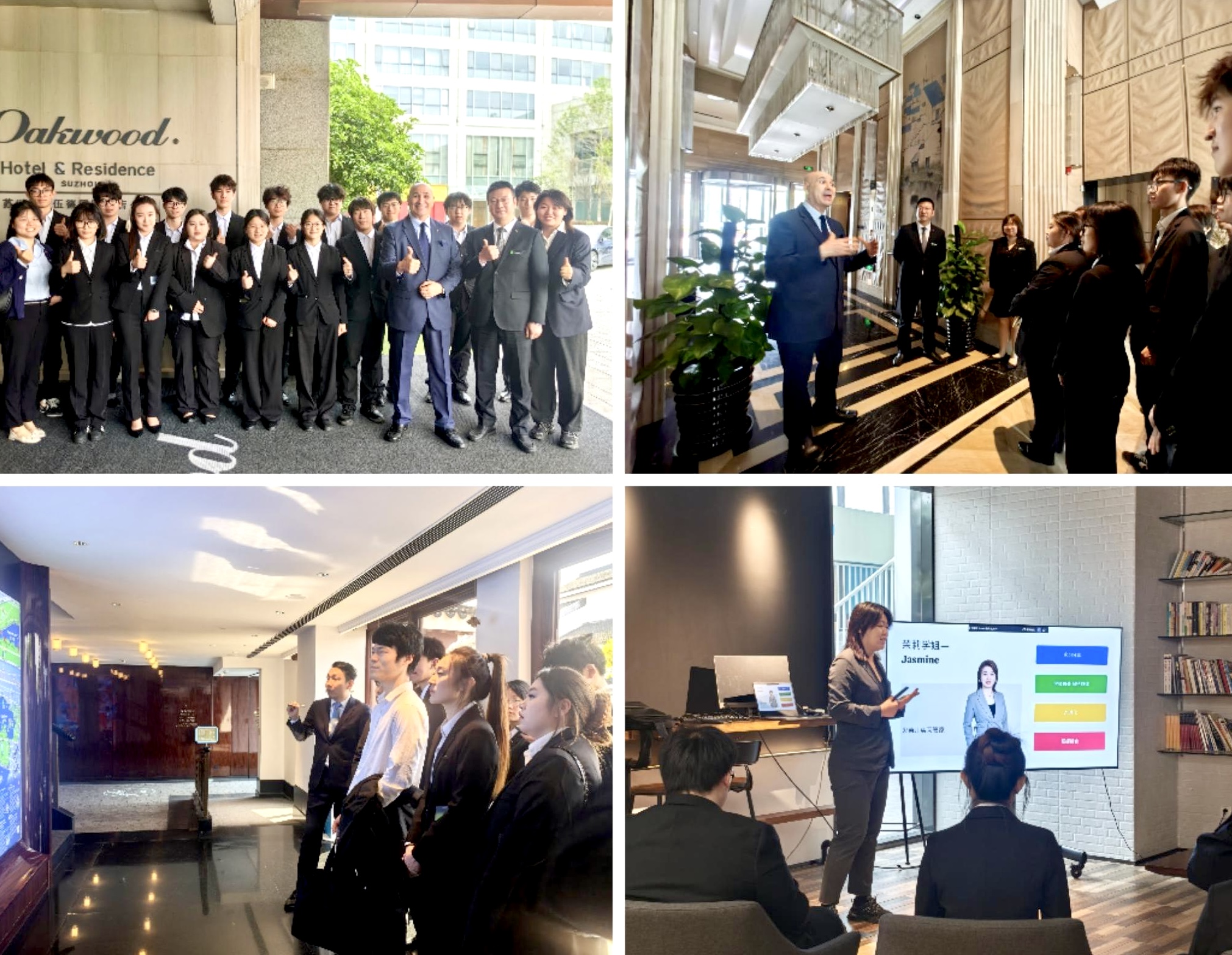 4月23日,实训聚焦多元化业态。金鸡湖大酒店以高端会议接待和湖景度假资源为核心,向学生示范了大型活动策划与奢华服务标准;奥克伍德酒店公寓则立足长住型客群需求,阐释了服务式公寓的运营特色与市场定位。参访中,学生通过模拟岗位实操,体验了不同业态对管理技能的差异化要求。