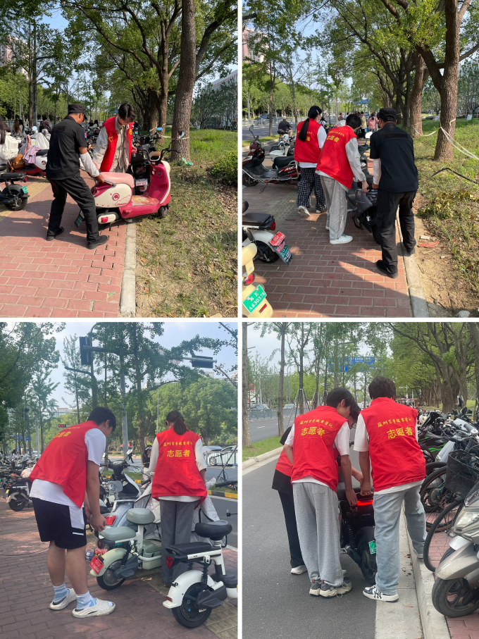 活动期间,学院组织各班级学生代表,每日分上午、下午两个时段,在学校东门开展机动车引导与摆放志愿服务,本次活动以“服务校园、锻炼自我”为宗旨。身着统一志愿服、佩戴工作牌的学生志愿者们,穿梭在东门的车流中,协助安保和后勤部们引导过往师生有序停放非机动车辆,主动将违规停放的电动车整理归位,全力维护校园交通秩序。