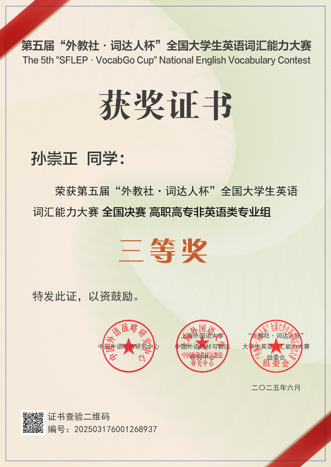 近期,2025年第五届“外教社·词达人杯”全国大学生英语词汇能力大赛省赛与国赛圆满收官。我校二十余名精英学子奋勇拼搏。经过一番激烈角逐,共有12名同学获得省赛奖项,其中戚宇诚和孙崇正两位顺利晋级国赛并获国赛三等奖。