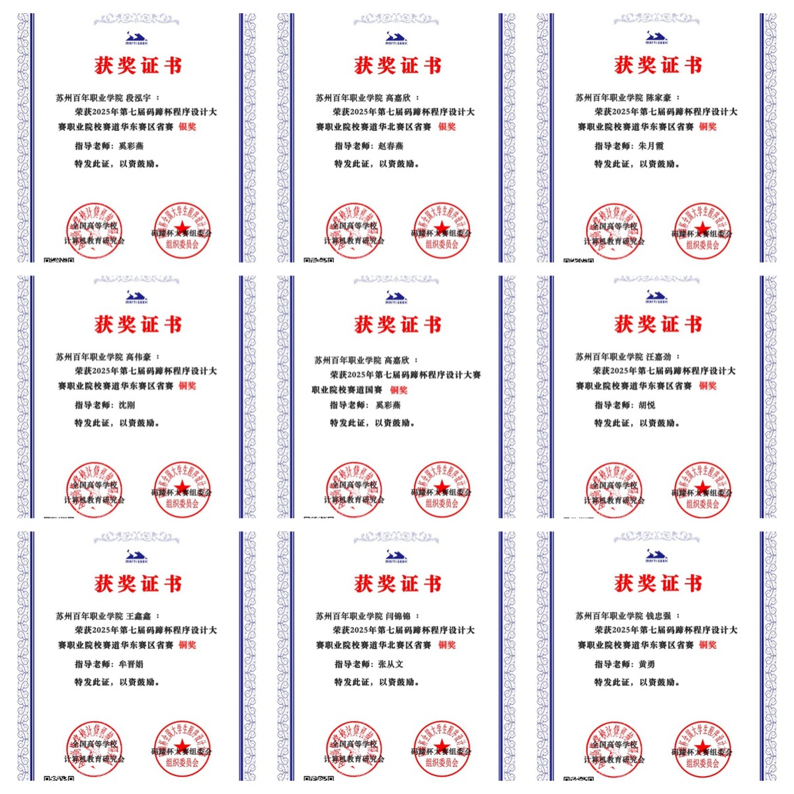国赛亮剑,再创佳绩:经过省赛选拔,高嘉欣、段泓宇等多名同学成功晋级 2025年8月的全国总决赛。在职业院校赛道的激烈角逐中,高嘉欣沉着应对复杂算法问题与高强度编程挑战,最终斩获国赛铜奖,成为全国职业院校编程领域的优秀代表。