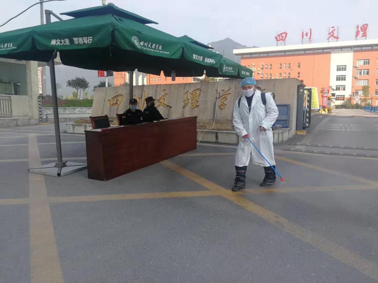 后勤工作人员正在进行校园公共区域环境消杀工作