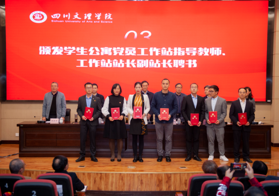 校领导为学生公寓党员工作站指导教师、工作站站长、副站长颁发聘书。指导教师弓腊梅和学生公寓党员工作站站务工作人员陈春妃作交流发言。会后,校领导深入学生公寓党员工作站检查指导。