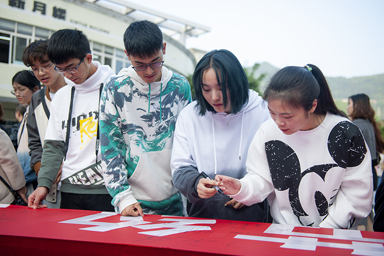校领导在“厉行勤俭节约制止餐饮浪费”横幅上签名
