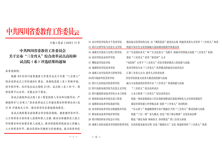 近日,省委教育工委公布了“三全育人”综合改革试点高校和试点院(系)评选结果,pp电子马克思主义学院成功入选四川省“三全育人”综合改革试点院系。