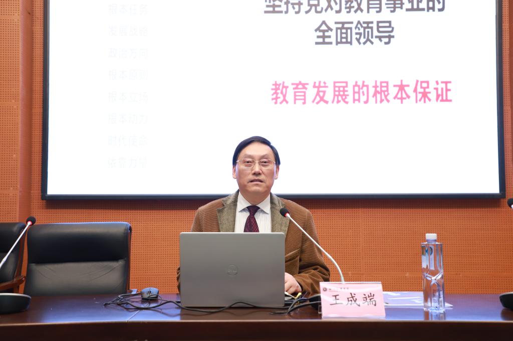 王成端教授紧紧围绕习近平总书记教育重要论述作讲授。他说,习近平总书记作为马克思主义政治家、思想家和战略家,始终站在“百年未有之大变局”的世界视野下看教育,始终联系“中华民族伟大复兴”的战略全局看教育,始终抓住教育的根本问题来思考教育,围绕中国教育发展作出了一系列重要讲话,提出了一系列新理念新思想新观点,形成了习近平总书记关于教育的重要论述,开拓了马克思主义教育思想的新境界。特别是以全国教育大会为标志,形成了较为丰富完整的思想理论体系。