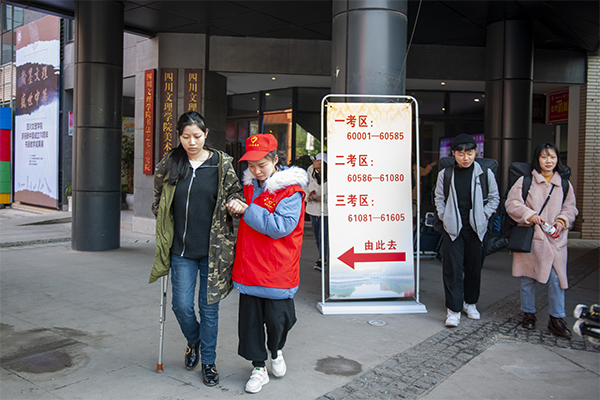 志愿者搀扶考生