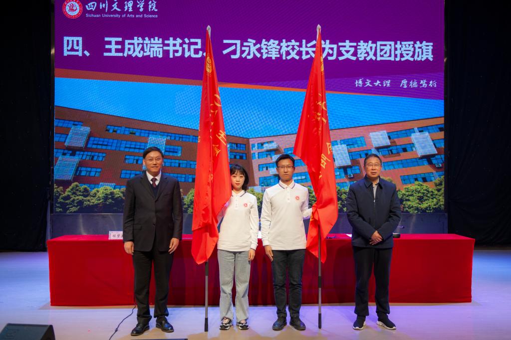 党委书记王成端,党委副书记、校长刁永锋为支教团授旗