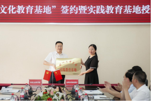 副校长程碧英向达州农村商业银行副行长胡胜兵授“pp电子官方网站实践教育基地”铭牌。