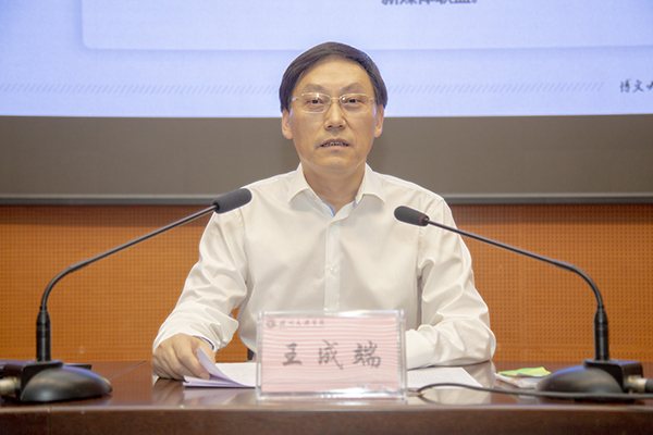 王成端作《不忘初心 牢记使命 为建成特色鲜明优势突出的高水平应用型大学而砥砺奋进》党课学习辅导。他以《诗经·大雅》中的诗句“靡不有初,鲜克有终”引出初心和使命,并结合学校第一次党代会决策部署,总结会议以来学校改革发展取得的成就,分析当前存在的问题。