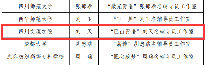 “高校思想政治教育名师工作室申报工作”由中共四川省委教育工委、四川省教育厅审核,旨在突出育人特色,发挥引领作用,培育优秀团队,打造工作品牌,有效促进思政工作队伍职业化、专业化发展。此次面向全省征集申报,共立项名思政课教师工作室10项、名辅导员工作室20项、心理健康教育名师工作室6项。