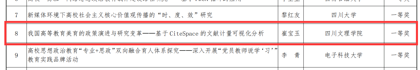 日前,中共四川省委教育工委、四川省教育厅公布了高校思想政治教育名师工作室名单,四川省高等学校学生思想政治工作研究会公布了2021年、2020年全省高校辅导员优秀论文评选结果。外国语学院刘天主持的“巴山青语”刘天名辅导员工作室申报成功,化学化工学院崔宝玉撰写的论文《我国高等教育美育的政策演进与研究变革——基于 CiteSpace 的文献计量可视化分析》获得2021年优秀论文一等奖、康养产业学院周宏星撰写的论文《习近平青年教育思想探析》获2020年优秀论文二等奖。
