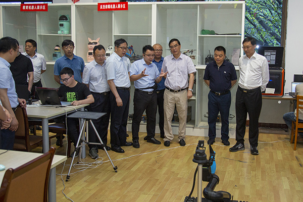 郭亨孝一行首先参观学校科技成果和创新创业、智能制造成果展,随后来到研究院创新创业孵化中心,实地考察慧鱼机器人展示区、反恐排爆机器人展示区、创客空间作品展示区、无人机展示区、加工制作区,听取智能制造研究院院长蒲国林教授、副院长陈光平博士的情况介绍,并就机器人研究进展及成果转化情况与参与项目研究的师生亲切交流,鼓励科技创新团队加强应用研究,积极对接企业和产业,更好地服务达州经济社会发展,促进地方产业升级和新业态发展。