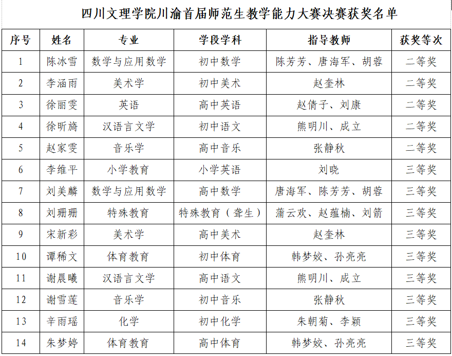 近日,川渝首届师范生教学能力大赛成功落下帷幕,pp电子14名选手进入决赛,其中陈冰雪、李涵雨、徐丽雯、徐昕旖、赵家雯等5位学生获得二等奖,李维平、刘美麟、刘珊珊、宋新彩、谭稀文、谢晨曦、谢雪莲、辛雨瑶、朱梦婷等9位学生获得三等奖。获奖学生分别来自数学与应用数学、英语、汉语言文学、化学、小学教育、特殊教育、音乐学、美术学、体育教育等9个专业。
