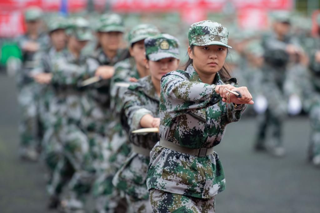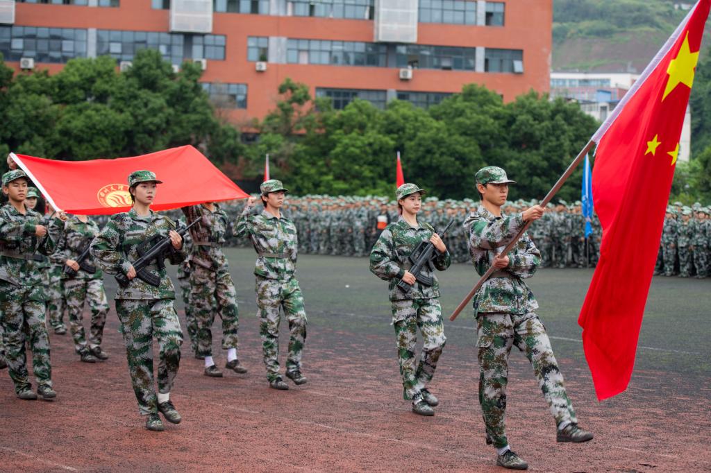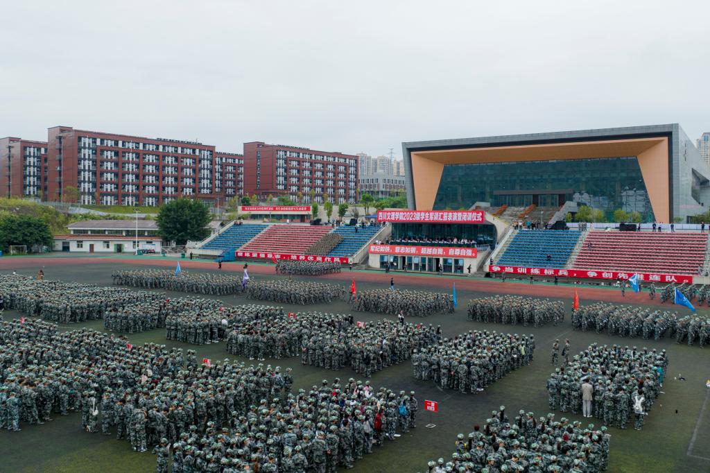 茵草长空着戎装,苍穹之下斗志扬。在分列式上,同学们精神抖擞,意气飞扬,就着激昂的旋律,喊着铿锵有力的口号、迈出整齐划一的步伐。在特色科目表演过程中,擒敌术手型方阵昂扬奋发、军姿严整;匕首操练方队敏捷流畅、气质非凡;应急棍方队所向披靡、棍棍生风;擒敌拳方队虎虎生威、气势磅礴。这全方位展示了同学们军训的丰硕成果,体现出各方队高强度的组织纪律性、优良的军事素养和昂扬的精神风貌,也充分展示了川文理学子青春澎湃的力量与担当,发出了时代的强音,展现出强国一代听党话、跟党走的坚定决心。