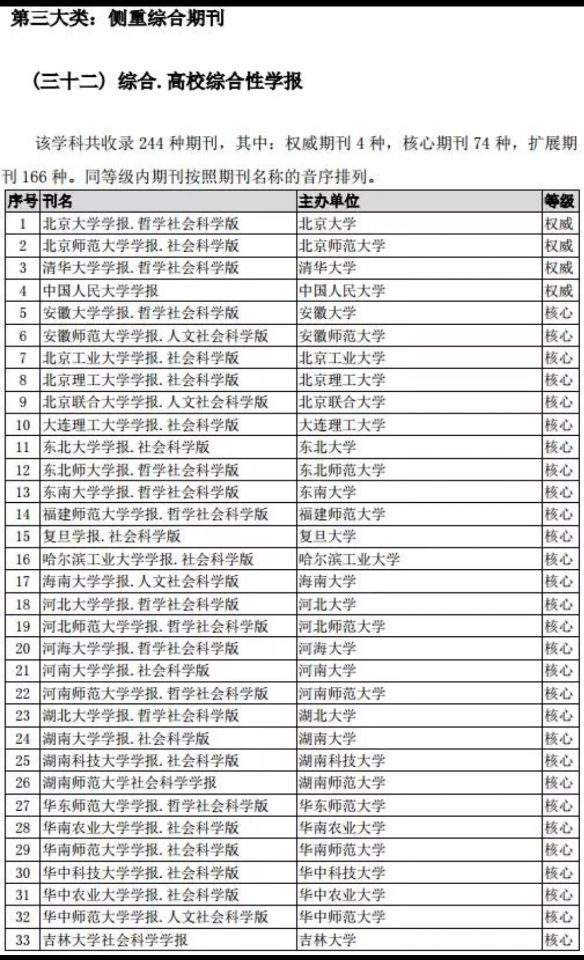 中国人文社会科学期刊AMI综合评价报告中“综合、高校综合性学报”共收录244种期刊。其中,权威期刊4种,核心期刊74种,扩展期刊166种。同等级内期刊按照期刊名称的音序排列。A刊评价按三大类、多个学科划分,评价指标体系由3个一级指标(吸引力、管理力和影响力),10个二级指标(获奖情况、同行评议、学术不端、编辑队伍、作者队伍、信息化建设、学术影响力、国际影响力等)和24个三级指标构成,设置一票否决制。