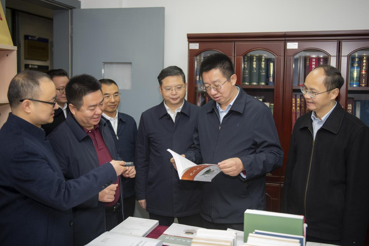 考察组考察了研究基地办公、设施设备等硬件条件,查看了基地实体图书、标志性科研成果、电子图书资源等。
