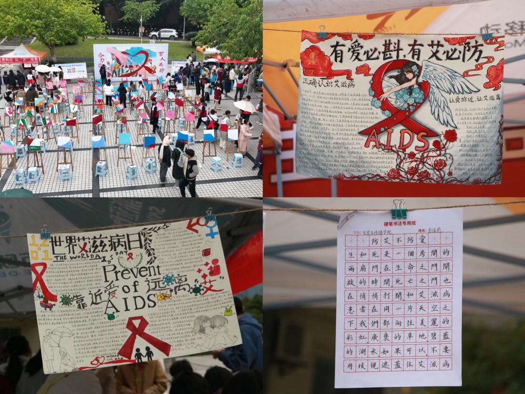 活动现场,pp电子师生参与了HIV验血筛查活动、“百人共绘、合力抗艾”活动、“艾”的抱抱、防艾作品展览、“艾与玫瑰”等系列活动,手语协会表演了《明天,你好》。