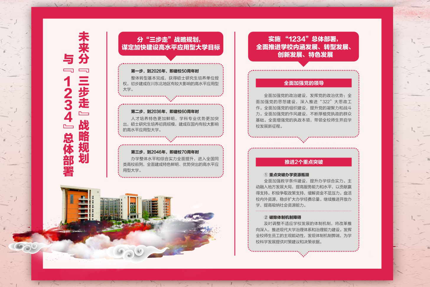大会高举习近平新时代中国特色社会主义思想伟大旗帜,全面总结学校升本以来党的建设和改革发展取得的成绩,确定了今后一个时期分“三步走”的战略规划和“1234”战略部署。