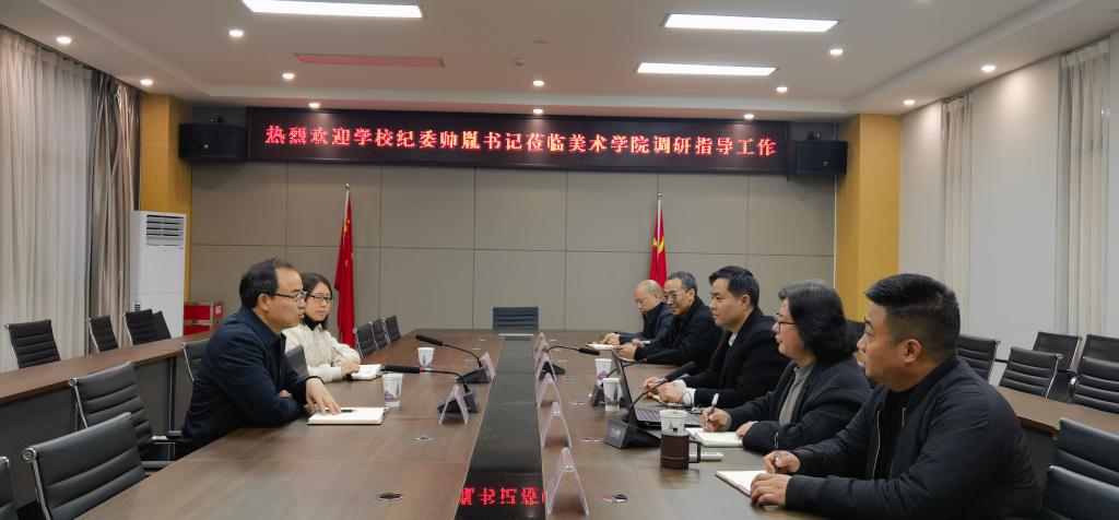 帅胤对美术学院党的建设、干部队伍、学科建设、专业认证、科研创作、学生培养、美育教育、产教融合、社会合作等方面取得的成绩给予了充分肯定,对美术学院党建思政、廉政建设、专业发展、合作育人等工作给予了深入指导。他指出,要深入学习贯彻习近平新时代中国特色社会主义思想,以党的理论武装头脑,让师生在教学、创作实践中学习与体现,并落实好基层党组织“三会一课”制度;要履行好党组织主体责任,抓好组织建设、制度建设和党风廉政建设;要抓好意识形态工作,筑牢思想政治根基,加强青年党员和艺术人才的思想政治教育;要发挥专业优势开展党风廉政建设主题创作,为廉洁文化建设做贡献。他还对调研中发现的基础建设、实习实训、职称评聘等问题给出了中肯的建设指导意见。