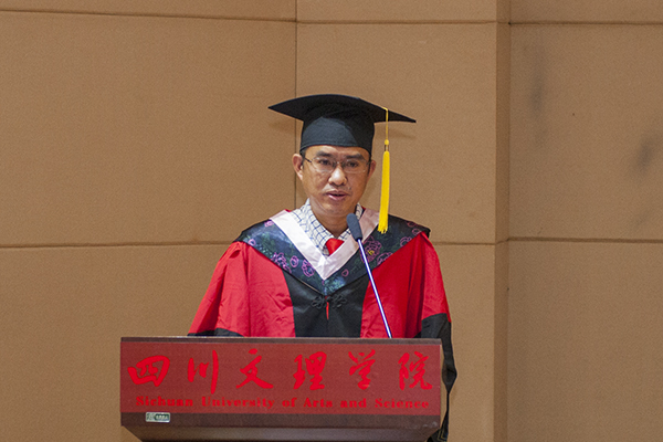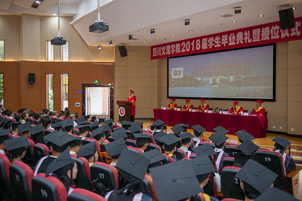 校长刁永锋在致辞中感慨到:梧桐叶上三更雨,叶叶声声是别离。忆往昔,教室、图书馆、实验室及校园每个角落都可以看到你们埋头苦读的身影;校园文化体育活动场所经常见到你们青春矫健的雄姿;创新创业道路上你们勇敢探索,不少人成为了创业达人,收获了人生的第一桶金。无论天南地北,无论身居何位,都请好好珍藏这一段“文理印记”。他说,学校虽然现在还不是“白、富、美”,还不够“高、大、上”,但是他希望同学们要“白”在洁身自好、“富”在精神富足、“美”在内外兼修,“高”为志存高远、“大”为宏图大略、“上”为上善若水。”他深情地寄语毕业生:坚持梦想,做有为之人;坚持信念,做担当之人;坚持自我,做干净之人;坚持初心,做感恩之人。