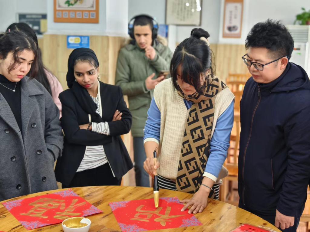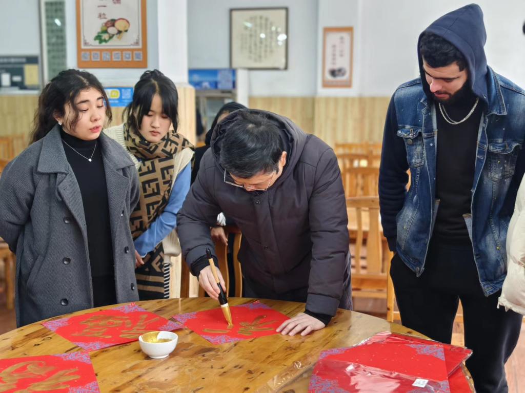 龙年书法艺术体验,笔墨迎春知“年俗”,“横如云阵、纵如流瀑、直如垂露、点如星斗。”在龙年书法艺术体验活动中,留学生们真切感受了中国书法之美。“福”字的一笔一划,诠释着春节的美好寓意。在教师悉心指导下,留学生们纷纷拿起毛笔,一笔一划认真学习书写“福”字,感受和认识“福”字在中国的美好寓意。