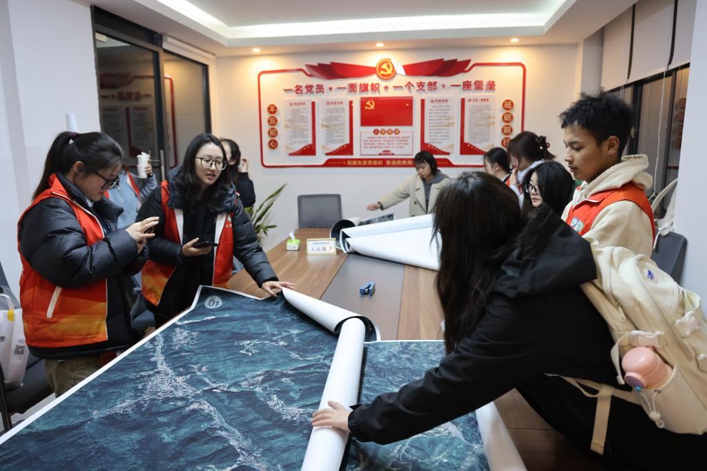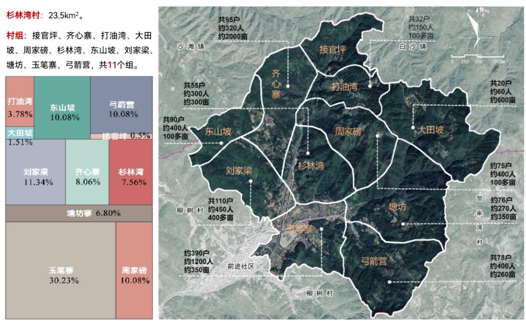 按照学校帮扶工作部署,建筑工程学院、生态旅游学院在2023年12月制定了杉林湾村村庄规划编制方案,组建专业教师技术团队、学生志愿者调研小组。团队于2024年1月10日入驻杉林湾村进行实地调查。在杉林湾村,师生调研团队通过无人机航测、入户走访、问卷调查等方式,充分梳理了村庄地形地貌、自然环境、建筑、道路、基础设施、产业、文化、人口、社会经济等方面的基础情况,并经过与村委会、村民代表的多次讨论,规划团队综合评估了杉林湾村的优劣势、挑战和机遇,充分结合省、市村庄发展政策,将杉林湾村整体发展目标定位为“山水宜居好家园、乡村振兴新示范”。