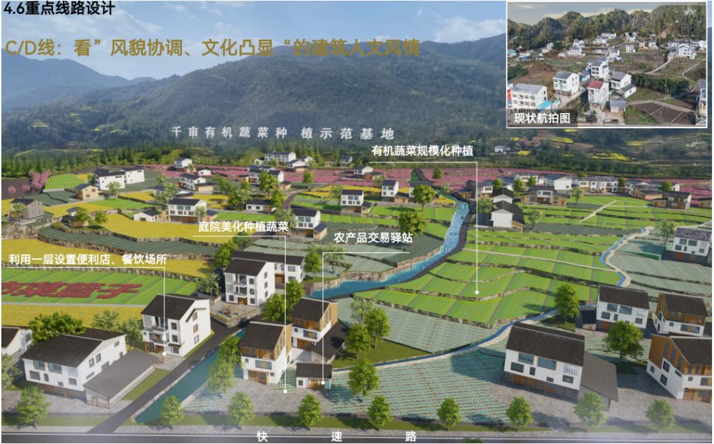 此次规划积极针对杉林湾建设及近期发展的迫切需要,对村庄临近场镇地段进行了“千万工程”先行区的重点设计。先行区以六条线路为骨架,形成“乡愁村居、蔬果满园、传统风情、生态绿林”四个发展主题,并结合闲置、荒废、街头等空间布设广场、集市、驿站、民宿等多种场所。同时,规划还结合典型民居建筑,融合地域文化、产业类型等特点,提出庭院、住宅、街巷等空间的改造方案。