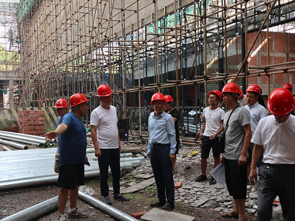 朱兴华深入多功能综合体育馆现场各部位进行走访,代表校领导慰问奋战在施工现场的工人及管理人员,听取施工单位、监理单位、跟审单位等各现场责任主体负责人就进度、安全、质量、造价等方面的详细情况汇报。
