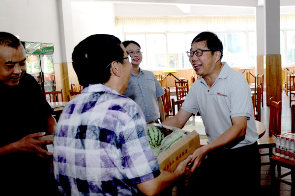 刁永锋仔细检查了食堂、学生公寓维修一线工作的各个细节,并与一线工作人员亲切交谈,对工作人员为学校发展付出的辛勤劳动表示感谢,叮嘱他们一定要做好防暑降温,并为他们送去了矿泉水、西瓜、防暑药品等慰问品。他强调,后勤工作是学校管理工作的重要组成部分, 为学校人才培养、师生生活及安全稳定作出了重要贡献。暑假期间,后勤、学生处、博大公司的老师们加班加点,不断改善学生食堂、公寓环境,做好水电抢修、防病虫害、校园绿化维护等各项工作。他要求,学生公寓、宿舍、教室维修等工作务必保证工程质量,抓紧施工时机及进度,同时注重细节体现人文性,为开学及学生返校做好充分准备。