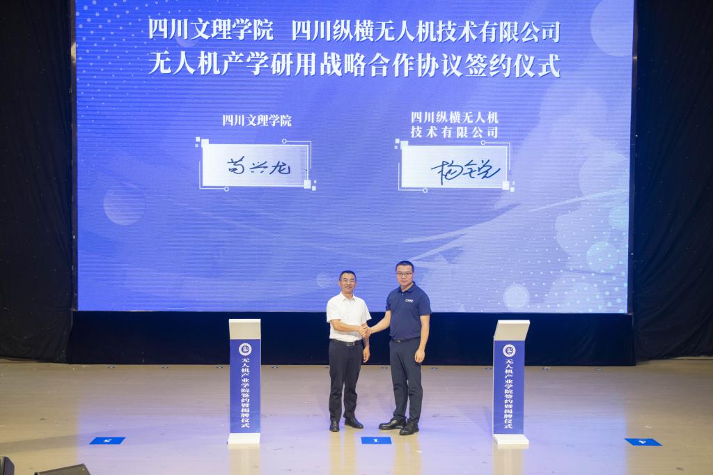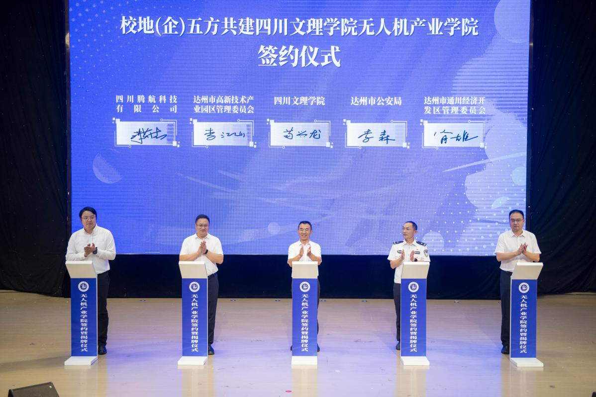 苟兴龙代表学校与四川纵横无人机技术有限公司签约,并与共建pp电子官方网站无人机产业学院的达州市公安局、达州高新技术产业园区管理委员会、通川经济开发区管理委员会、四川腾航科技有限公司签约。