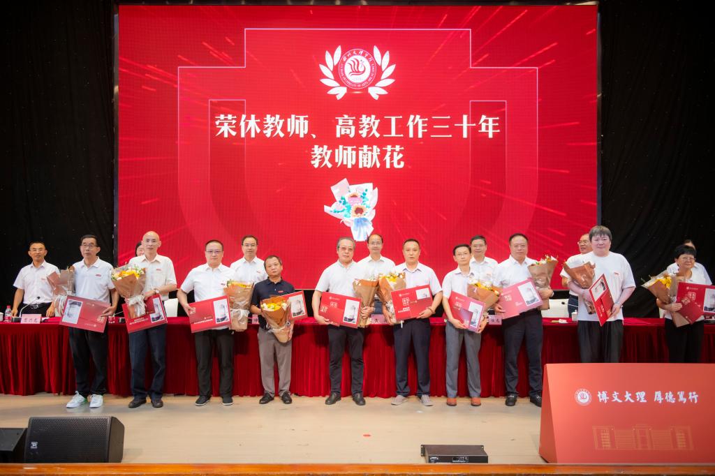 大会举行了2024年新教师入职仪式,为获评2024年度“优秀教师”“优秀教育工作者”、2023 年度科研工作先进集体、川渝第二届师范生教学能力大赛获奖指导教师、成渝地区双城经济圈国际中文教育大赛获奖指导教师、第四届四川省高校教师教学创新大赛获奖老师、第十一届青年教师优质课竞赛获奖老师颁奖,2024年荣休教师、从事高等教育工作满三十周年教师献花并颁发纪念卡、纪念章。