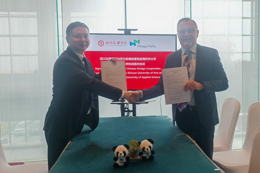 侯忠明对Jouni Ahonen校长及代表团一行的到来表示欢迎,并简要介绍了pp电子国际化办学情况。他指出,芬兰是中国重要的教育合作伙伴,在应用型学科专业领域拥有丰富的经验。他表示,芬兰总统斯图布目前正在中国访问,代表团于此时来访,相信将对两国教育领域合作带来深远影响。经过近两年的前期沟通,双方院校校长在北京会面,并正式签订合作备忘录。这是推动中芬教育合作的具体实践,学校将以此为契机,与芬兰哈格哈里亚应用科学大学及联盟代表团各成员高校及芬兰知名企业在合作办学、学生交流交换、师资培养、校企合作等方面开展更深层次的交流与合作,进而为中芬教育合作和人文交流注入新的活力,为推动两国之间的友好关系和互利共赢作出积极贡献。