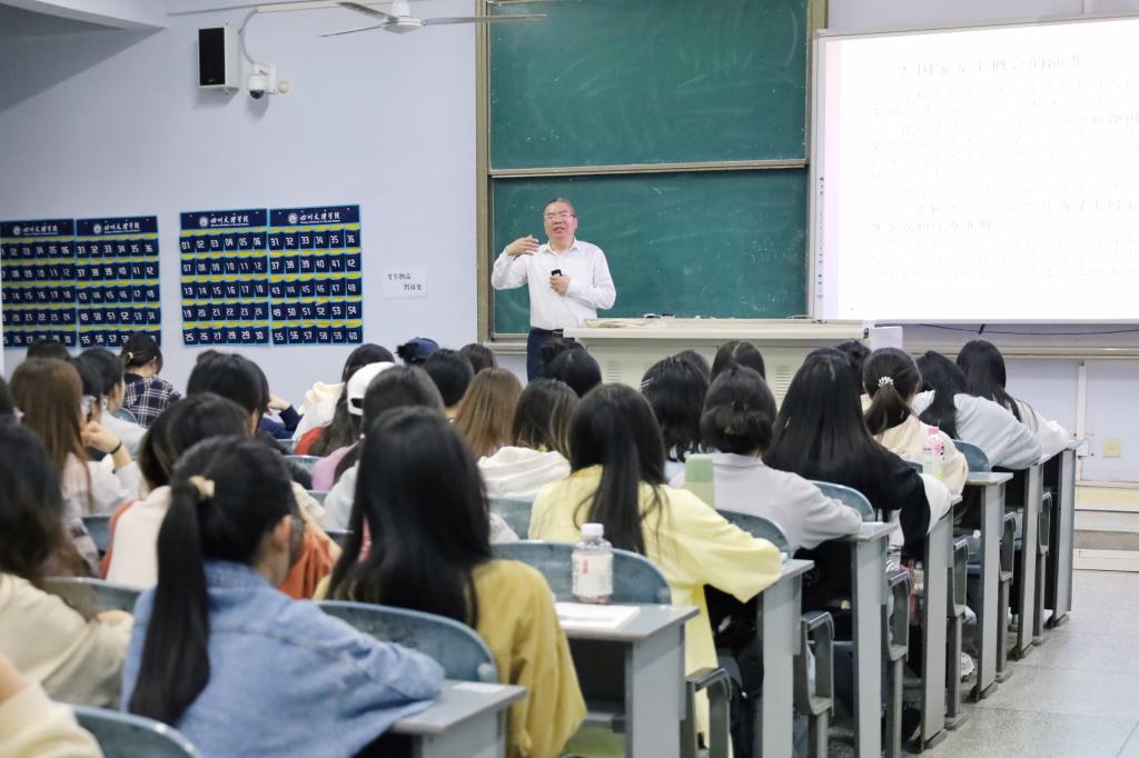 徐晓宗针对国家安全环境及形势的最新变化进行深入剖析,详细地阐述当前中国所面临的主要安全挑战。他深入探讨国家安全概念的演变历程,细致分析传统安全威胁与非传统安全威胁的不同类型。他指出,随着中国在不同历史时期和背景下的发展,国家安全观也经历了从“居安思危”到“大一统”,再到“崇尚和平、注重防御、刚柔并济”的历史性转变。授课期间,徐晓宗就国际形势由“两极格局”到“一超多强”的转变,提出“如何看待美国的衰退与中国的崛起”这一深刻议题,引发同学们的热烈讨论。他指出,面对世界百年未有之大变局,同学们应具备识变之智、应变之方、求变之勇的素质和能力,增强忧患意识,做到居安思危,始终贯彻总体国家安全观,以积极的态度和行动为世界和平与繁荣贡献新的力量。