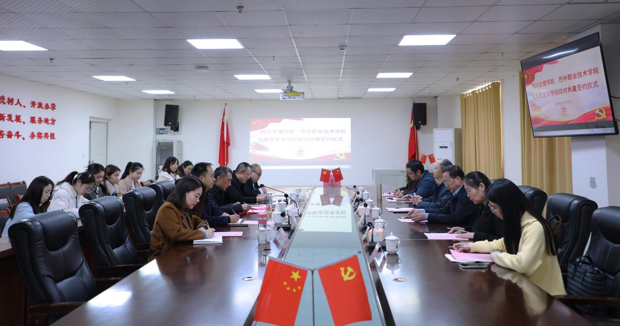 为深入学习贯彻习近平总书记关于思政课建设的重要指示精神,落实《中共四川省委教育工委四川省教育厅关于开展四川省高校马克思主义学院结对共建行动的通知》(川教工委函[2024]16号)文件精神,11月21日,学校党委书记黄涛一行赴巴中职业技术学院,举行两校马克思主义学院结对共建签约仪式。巴中职业技术学院党委书记、省政府督导专员张登宪出席会议并讲话。会议由巴中职业技术学院党委副书记、校长张伟主持。
