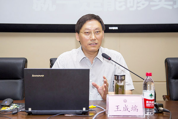 王成端教授以高等教育“四为服务”为视角,结合地方高校的责任与使命,从围绕一个根本任务深入领会习近平总书记讲话精神、着眼两个标准全面开展内涵建设、聚焦三项基础性工作建设高水平应用型大学、加强党的领导勇于担当好学生健康成长的指导者和引路人等四个方面作了深入浅出的分析和阐释。他说:扎根中国大地,办好中国特色社会主义大学是习近平新时代中国特色社会主义教育思想的新发展、新成果,高校必须坚定不移地把习总书记的教育思想作为办学治校、育人育才的指导方针,坚持不懈地传播马克思主义科学理论,培育和弘扬社会主义核心价值观。要把立德树人作为检验学校一切工作的根本标准,把师德师风作为评价教师队伍素质的第一标准,以一批爱岗敬业、教学效果好的优秀教师影响学生。王成端强调地方高校也要追求“高水平”,这个“高水平”代表的是地方同类院校的“高水平”,代表的是在应用型人才培养方面的“高水平”,代表的是服务区域经济社会发展的“高水平”,要以一流教学条件和优质的课程教育学生,更好地满足青年学生成长成才的需要,更好地服务区域经济发展。