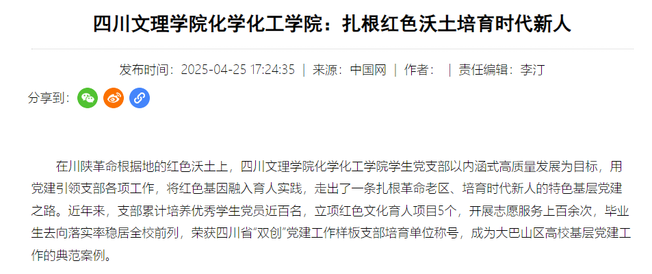 pp电子化学化工学院学生党支部以内涵式高质量发展为目标,用党建引领支部各项工作,将红色基因融入育人实践,走出了一条扎根革命老区、培育时代新人的特色基层党建之路。近年来,支部累计培养优秀学生党员近百名,立项红色文化育人项目5个,开展志愿服务上百余次,毕业生去向落实率稳居全校前列,荣获四川省“双创”党建工作样板支部培育单位称号,成为大巴山区高校基层党建工作的典范案例,其典范案例近日被中国网报道(中央重点新闻网站)。