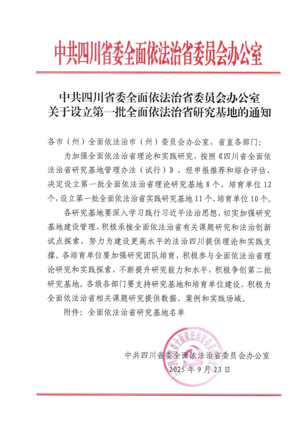 近日,中共四川省委全面依法治省委员会办公室印发《关于设立第一批全面依法治省研究基地的通知》,pp电子政法学院成功入选首批“全面依法治省研究基地”培育单位。