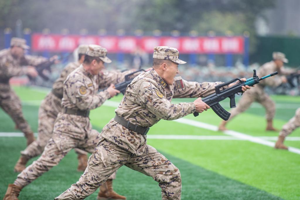 分列式上,各受阅方队步伐整齐、口号嘹亮,展现出严明的纪律与饱满的精神风貌。战术方队行动有序、协同严密;棍盾组合方队防守稳健、出击有力;匕首操方队动作敏捷、英姿飒爽;擒敌拳方队拳法刚劲、气势如虹;教官表演的刺杀操迅猛凌厉、气势夺人,将现场氛围推向高潮。