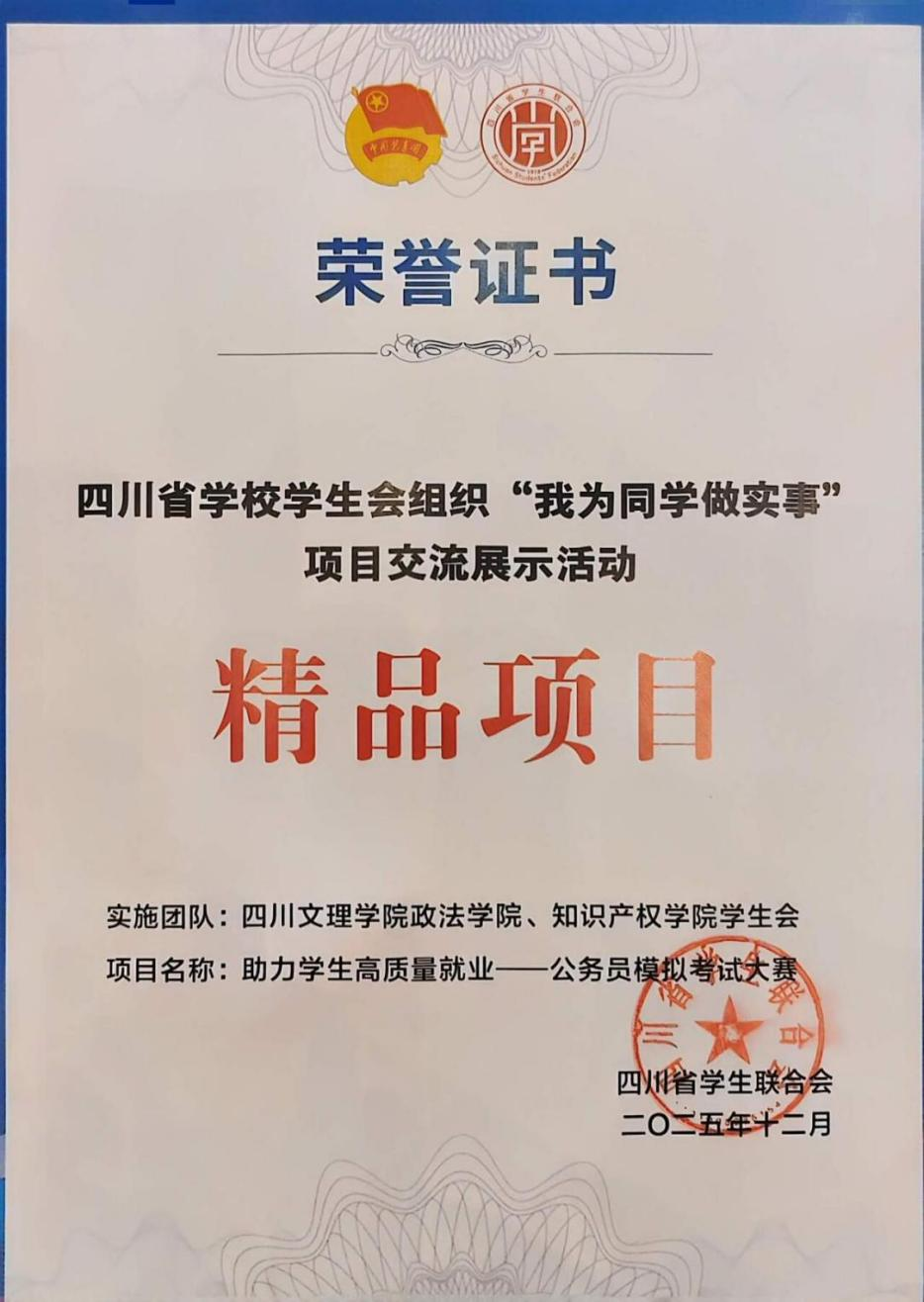 12月14日至15日,由共青团四川省委、四川省学生联合会主办的2025年四川省学校学生会组织“我为同学做实事”项目交流展示活动在成都举行。pp电子政法学院、知识产权学院学生会申报的“助力学生高质量就业——公务员模拟考试大赛”项目,成功入选2025年四川省学校学生会组织“我为同学做实事”精品项目。