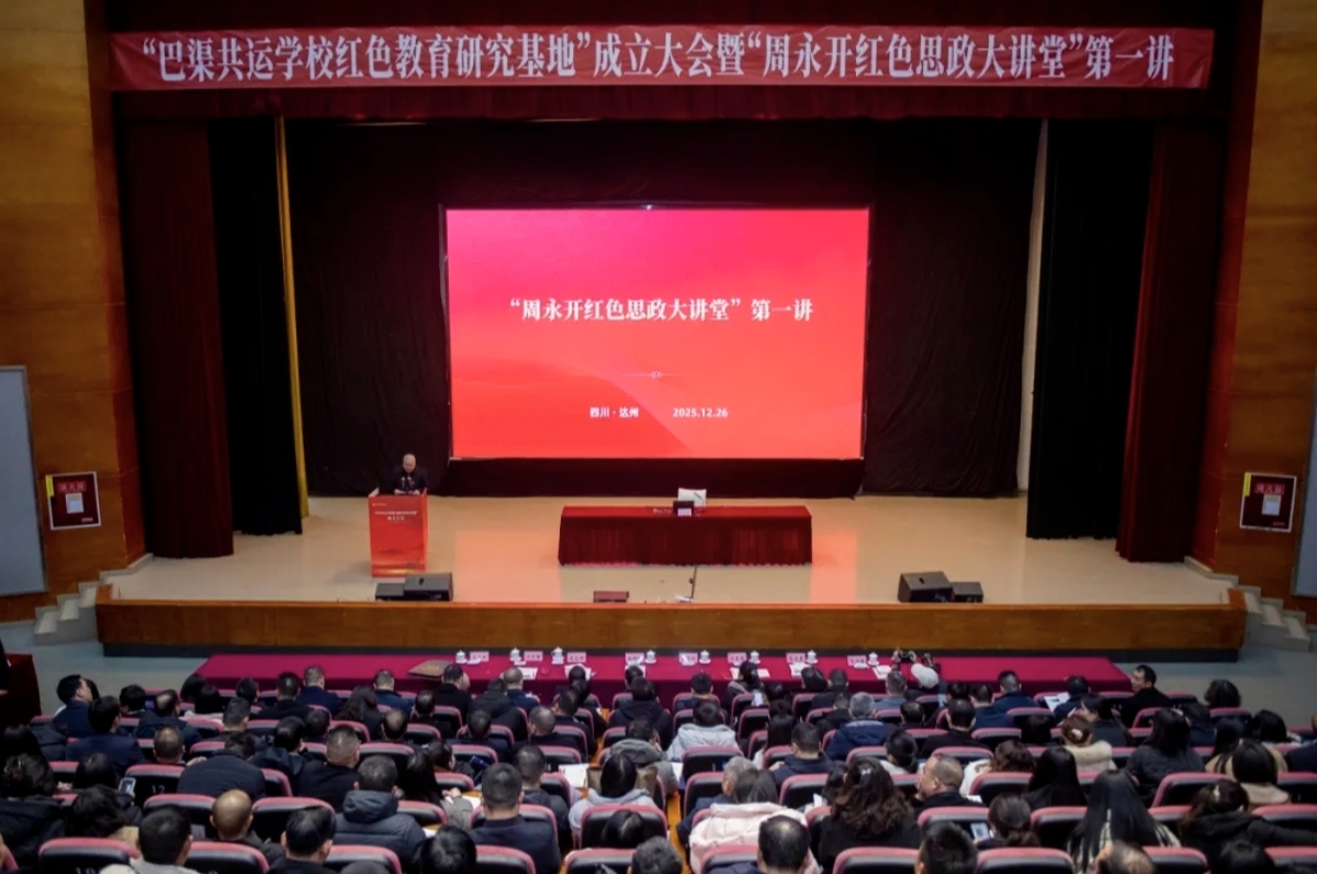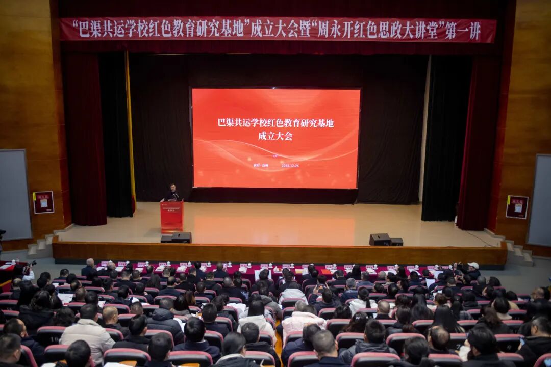 2025年12月26日上午,在纪念毛泽东同志诞辰132周年之际,pp电子官方网站艺术传媒大楼多功能厅庄重而热烈,“巴渠共运学校红色教育研究基地”成立大会暨“周永开红色思政大讲堂”第一讲在此隆重举行。本次活动由达州市委教育工委与pp电子官方网站联合主办,标志着川东北地区红色教育研究与实践迈向体系化、协同化、品牌化的新阶段。市级相关部门,巴中市、广安市委教育工委,原“巴渠共运友好学校联谊会”成员单位,大中小学思政课一体化共同体代表及师生代表等齐聚一堂,共襄红色教育盛举。